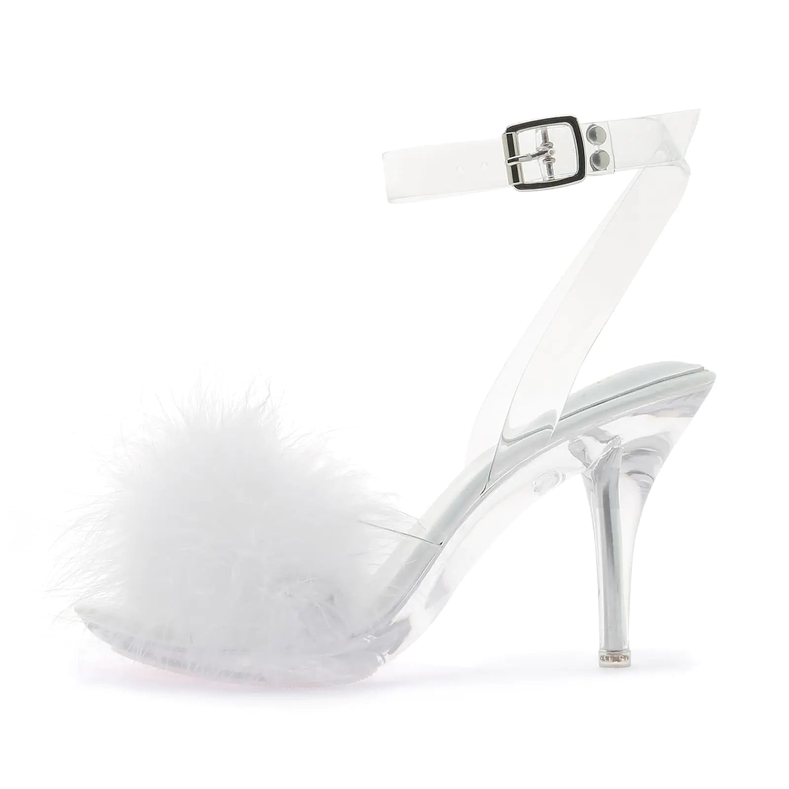 omthaka Womens Fuzzy Clear Heels Ankle StrapStilettos Heels Mules Sandals Fluffy Feather Slip On High Heeled Party Prom Dresses ShoesWhite-40 US9