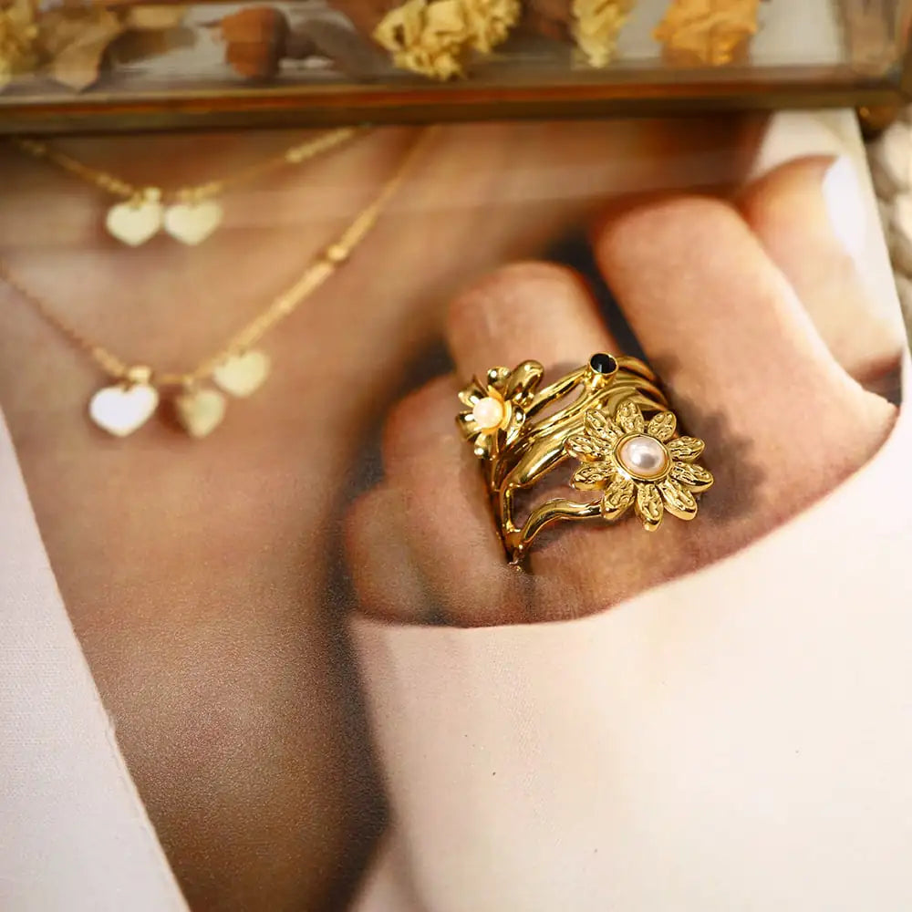 Discover the elegance and charm of our Pearl SUNFLOWER Titanium Steel Open-end Ring. This stunning piece of jewelry is designed to elevate your style while ensuring durability and a timeless appeal. Crafted from high-quality titanium steel, this ring features a beautiful 18K gold plating that resists fading, allowing you to shine on any occasion without worry.