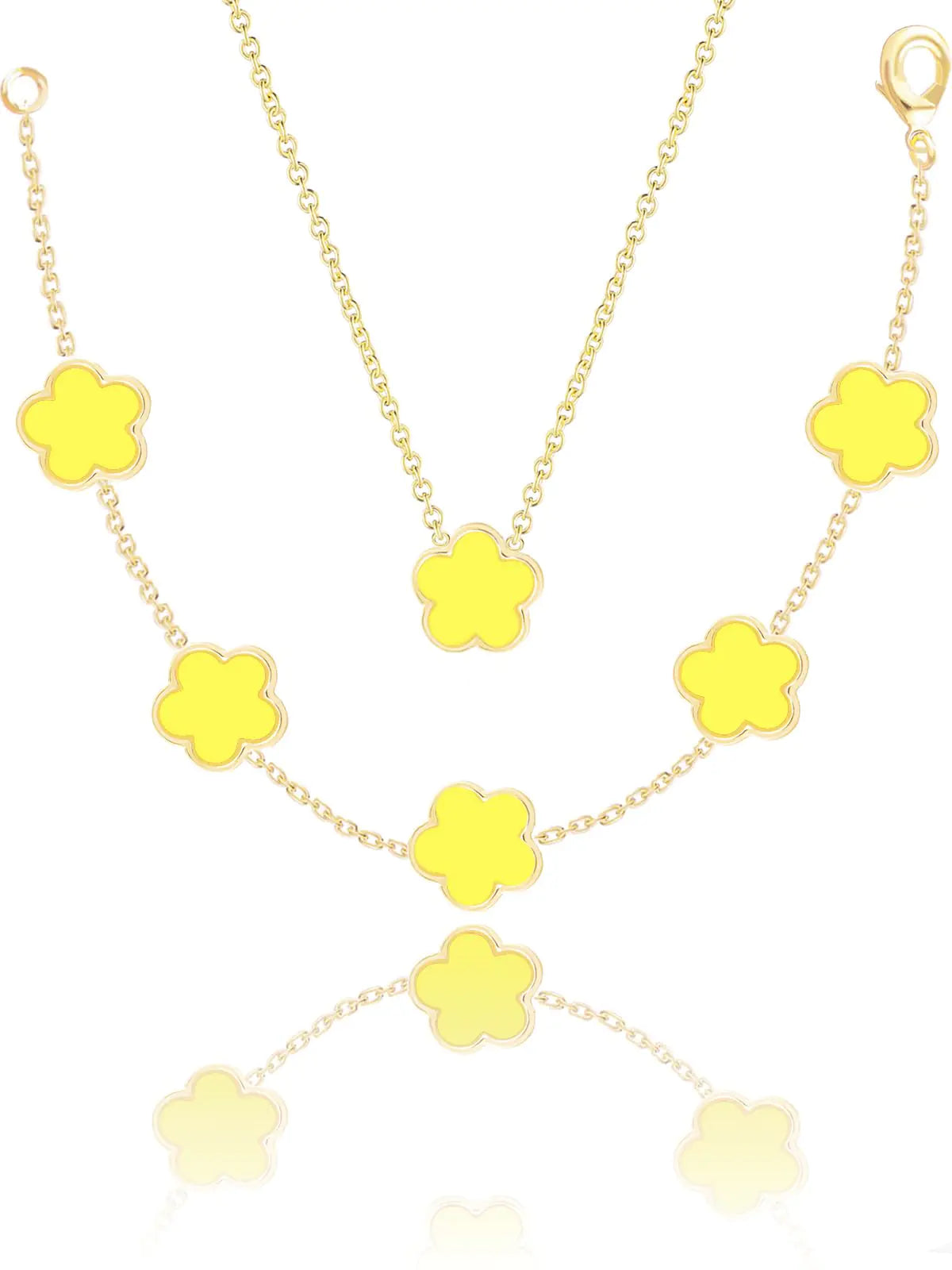 [A Four Leaf Clover Necklace Bracelet Set. These Yellow Luck Flower Shaped Jewelry Bracelet Measure 0.52" High 0.5" Wide 7 + 2 inch Chain Necklace Measure 0.52" High 0.5" Wide 18 + 2 inch Chain . The Weight of These Dainty Necklaces and Bracelets Sets is 12g. Hypoallergenic and Nickel free. Gorgeous for Bridesmaids Prom Homecoming Mothers of Bride and Special Occasions; Great for Jazzing Up Causal Attire as Well. The Perfect Clover Bracelet and Necklace Set! These Handmade Stunning Necklace Bracelet Sets Are Made with Plastic and Are Plated in 14K Glod to Ensure a Long Lasting Finish That is Nickel Free Lead Free and Hypoallergenic. "❤MADE WITH LOVE❤ Beautifully Packaged in a Eco-Friendly Reusable Gift Box Ideal for Bridal Wedding Prom Pageant Bridesmaids Parties Galas Valentines Day Formal Affairs Holiday Homecoming Special Occasions Birthday Mothers Day or Anniversary Gifts." ❤30 DAY GUARANTEE❤ To Ensure Your Complete Satisfaction 30 Day Warranty for Quality-related Issues; \u200bAll the Metals We Use Are Lead Free Nickel Free and Hypoallergenic. 100% After-sales Customer Service. QINPAN Jewelry 100% Guarantees Your Satisfaction. Please Search for QINPAN Jewelry on Amazon for More of Our Designs.]