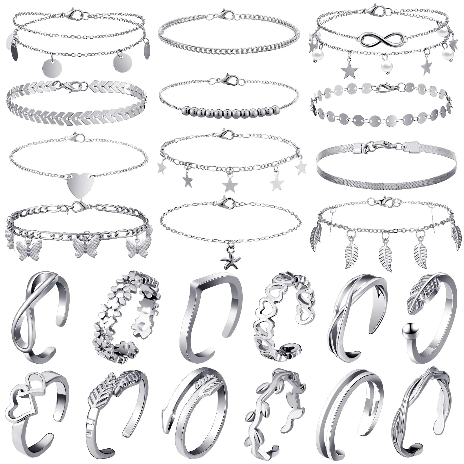 Sasylvia 24 Pcs Anklet and Toe Ring Set for Women Silver Gold Layered Anklet Chain Adjustable Open Toe Ring Foot Jewelry(Silver)