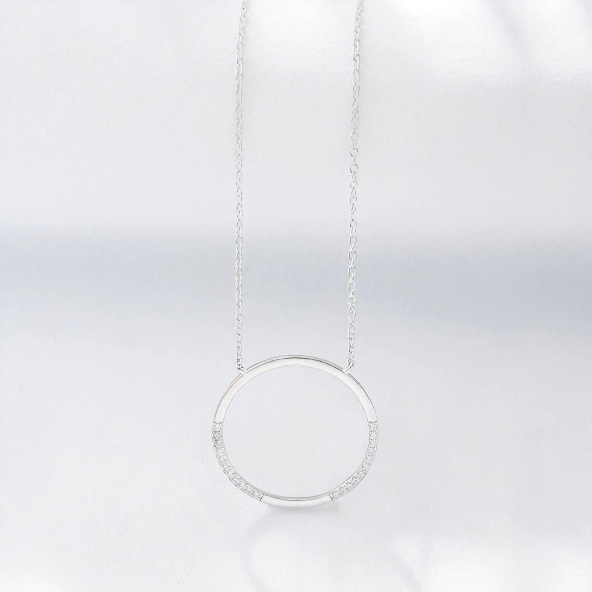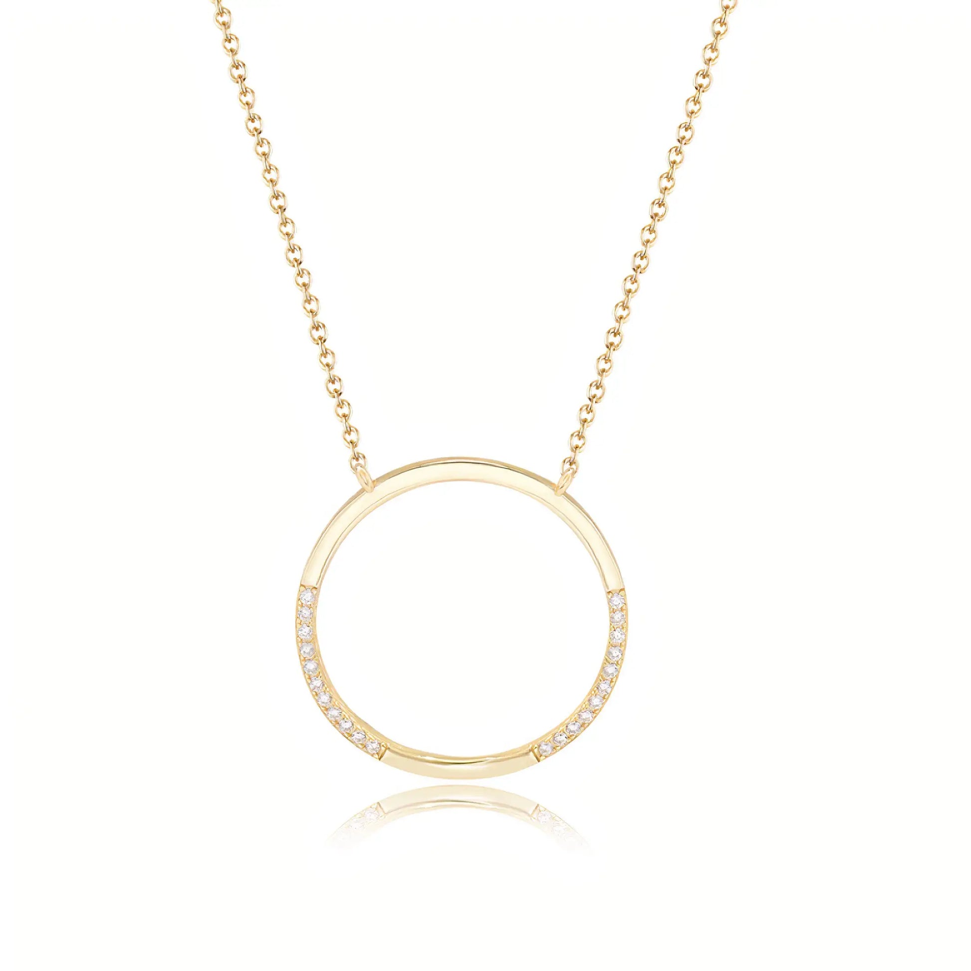 Exuding simple elegance, this dazzling pendant features an open circle studded with delicate Cubic Zirconia. This alluring necklace and circle pendant are hand-crafted using 18K gold plated sterling silver.